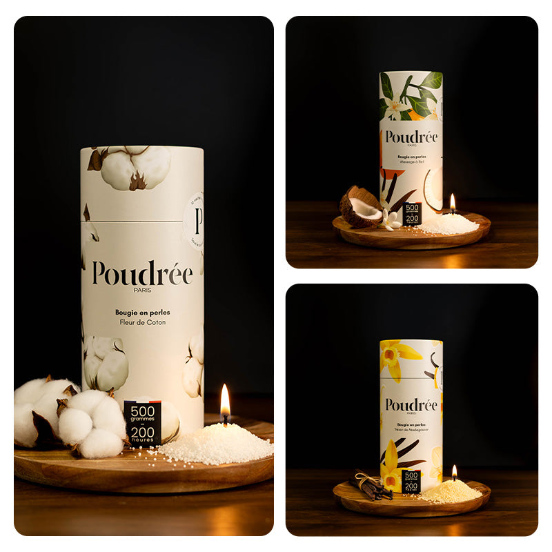 Entdecken Sie mit diesen 12 neuen permanenten Editionen unser Perlenkerzenkonzept neu, diesmal bereits angereichert mit neuen Düften von Poudrée Paris.